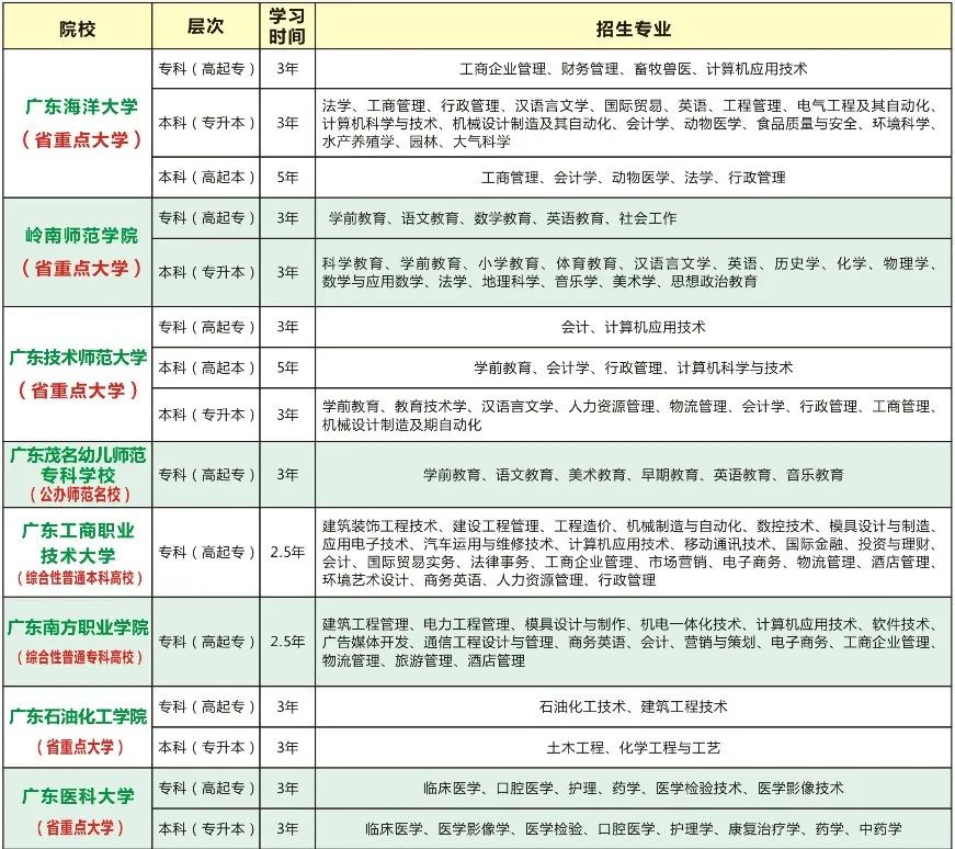 注:带★的为省委、省政府确定的原扶贫开发重点县。以今年省教厅正式文件为准。 六、学费标准 详见《2022年成人高等学历教育招生专业》 七、毕业和待遇 成人高等学历教育各专业招生经教育部和广东省招生委员会批准,国家承认其学历。被录取的考生修完教学计划规定的课程,考核成绩合格,符合毕业条件者,由录取高校颁发经国家教育部电子注册的成人高等教育相应层次的毕业证书,教育部学信网可查询。本科各专业毕业生凡符合学士学位授予条件者,经该校学位评定委员会审核通过,可授予学士学位。